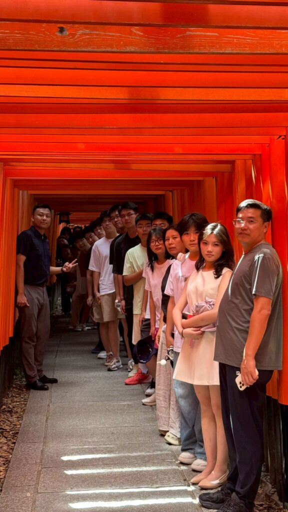 午前中は、京都を代表する名所である伏見稲荷大社と清水寺を訪問しました。千本鳥居で有名な稲荷大社では、日本独特の信仰や文化に触れることができ、学生たちもその壮観な景観に感銘を受けました。続いて清水寺では、古都ならではの歴史ある建築や街並みを楽しみ、日本文化の奥深さを体感しました。