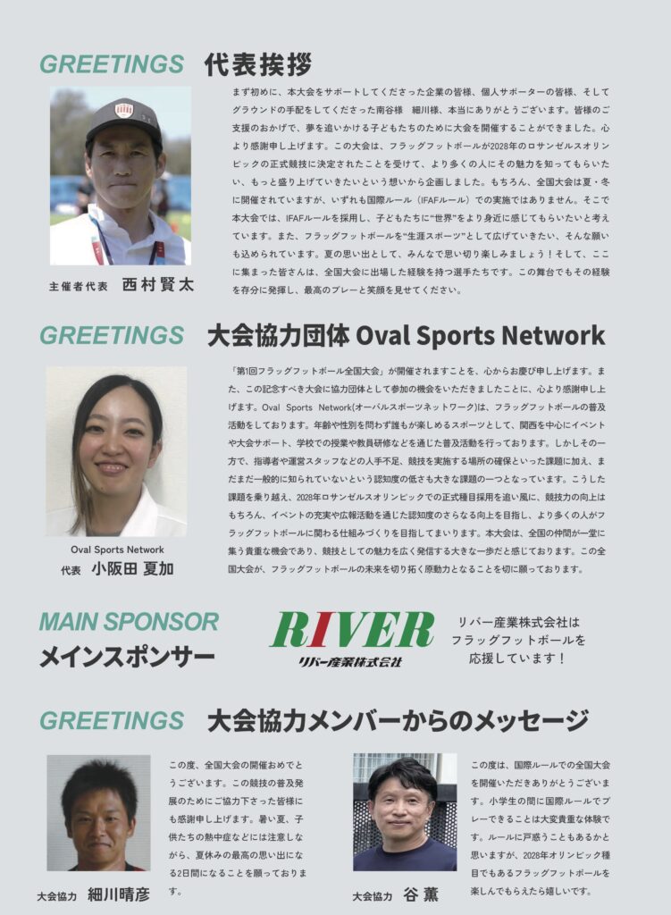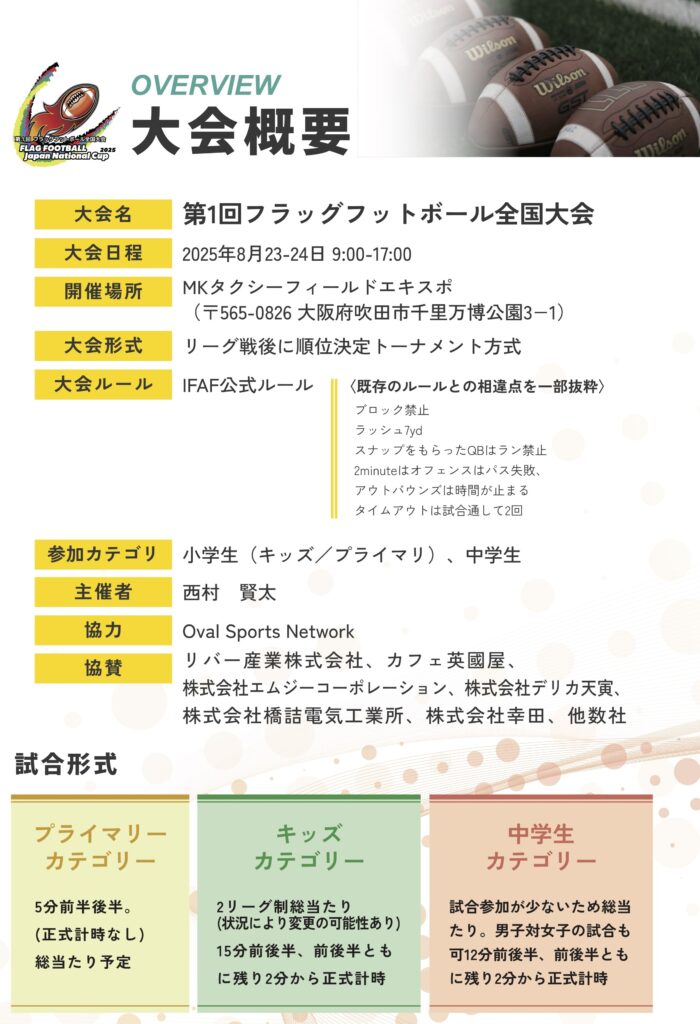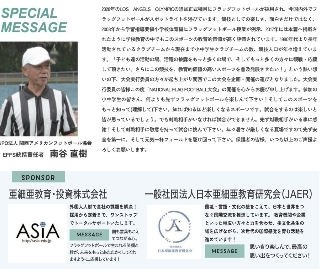 2025年8月の週末、大阪にて開催された「第1回フラッグフットボール全国大会」に、当社団法人日本亜細亜教育研究会(JAER)は一部協力団体として参加いたしました。